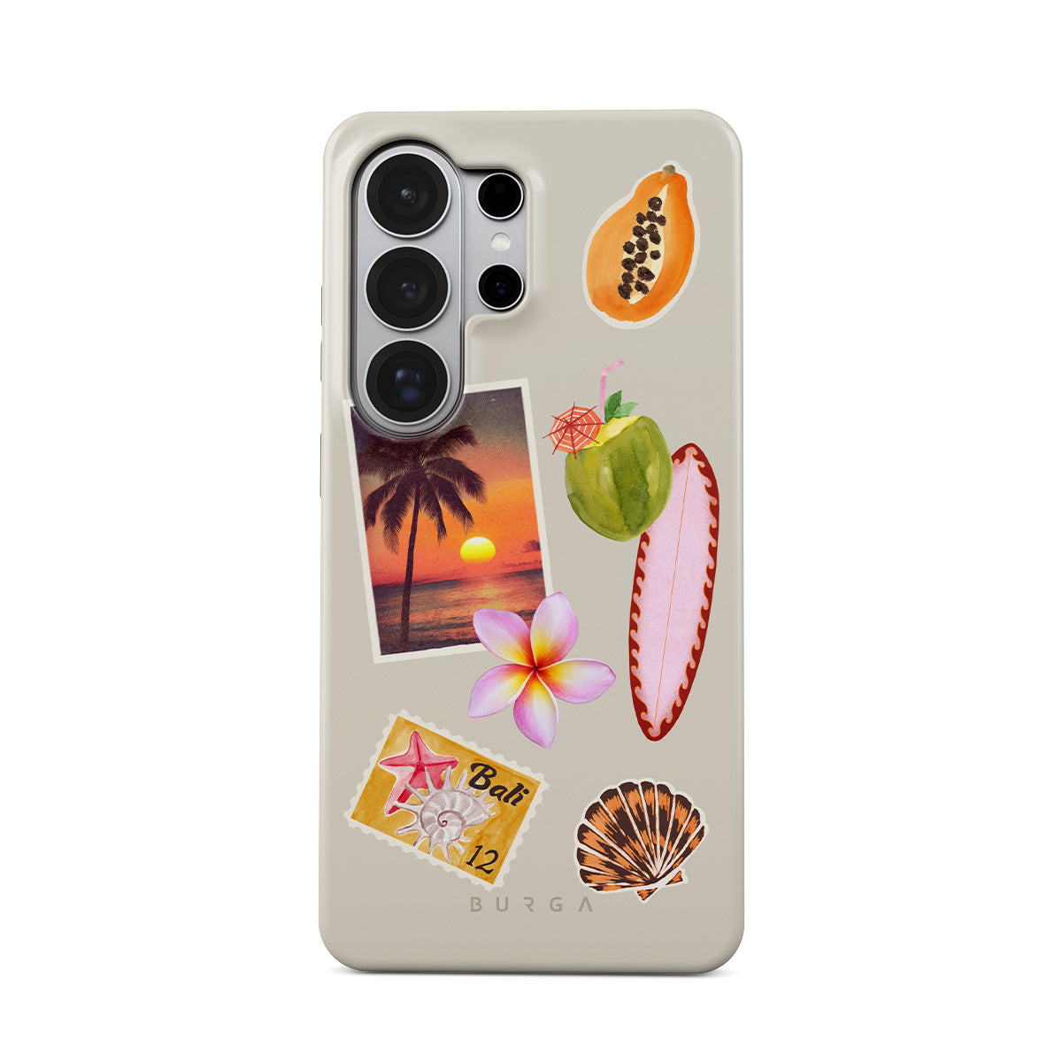 En este diseño: foto de atardecer tropical, papaya, coco verde, tabla de surf rosa, flor de plumeria rosa, concha naranja, postal de Bali.