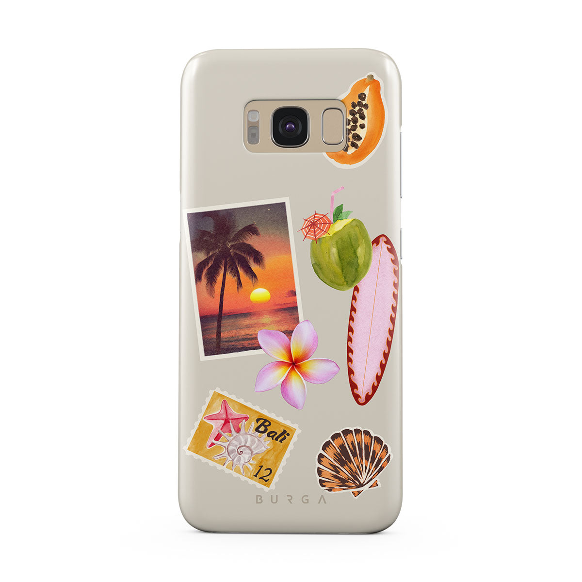 En este diseño: foto de atardecer tropical, papaya, coco verde, tabla de surf rosa, flor de plumeria rosa, concha naranja, postal de Bali.