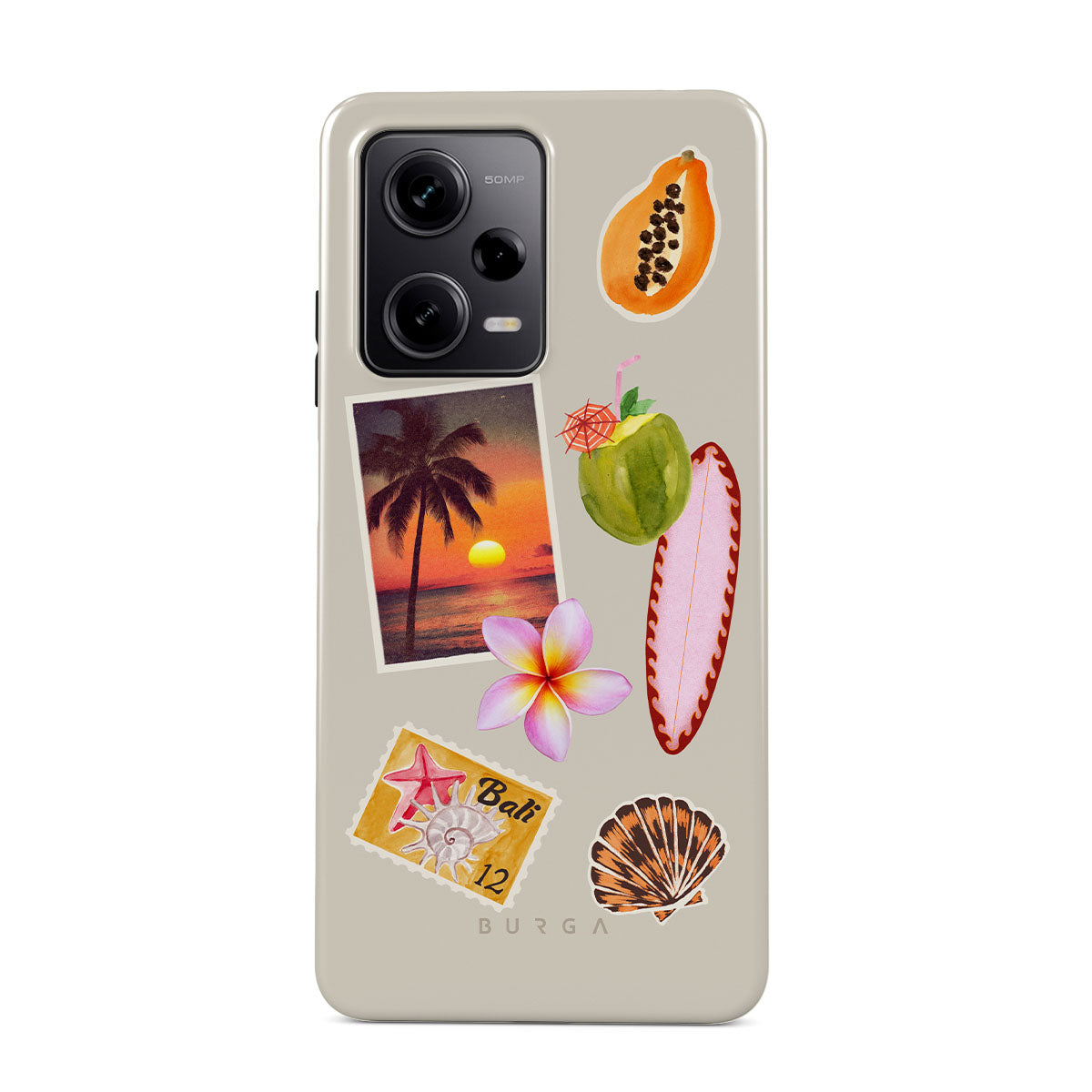 En este diseño: foto de atardecer tropical, papaya, coco verde, tabla de surf rosa, flor de plumeria rosa, concha naranja, postal de Bali.
