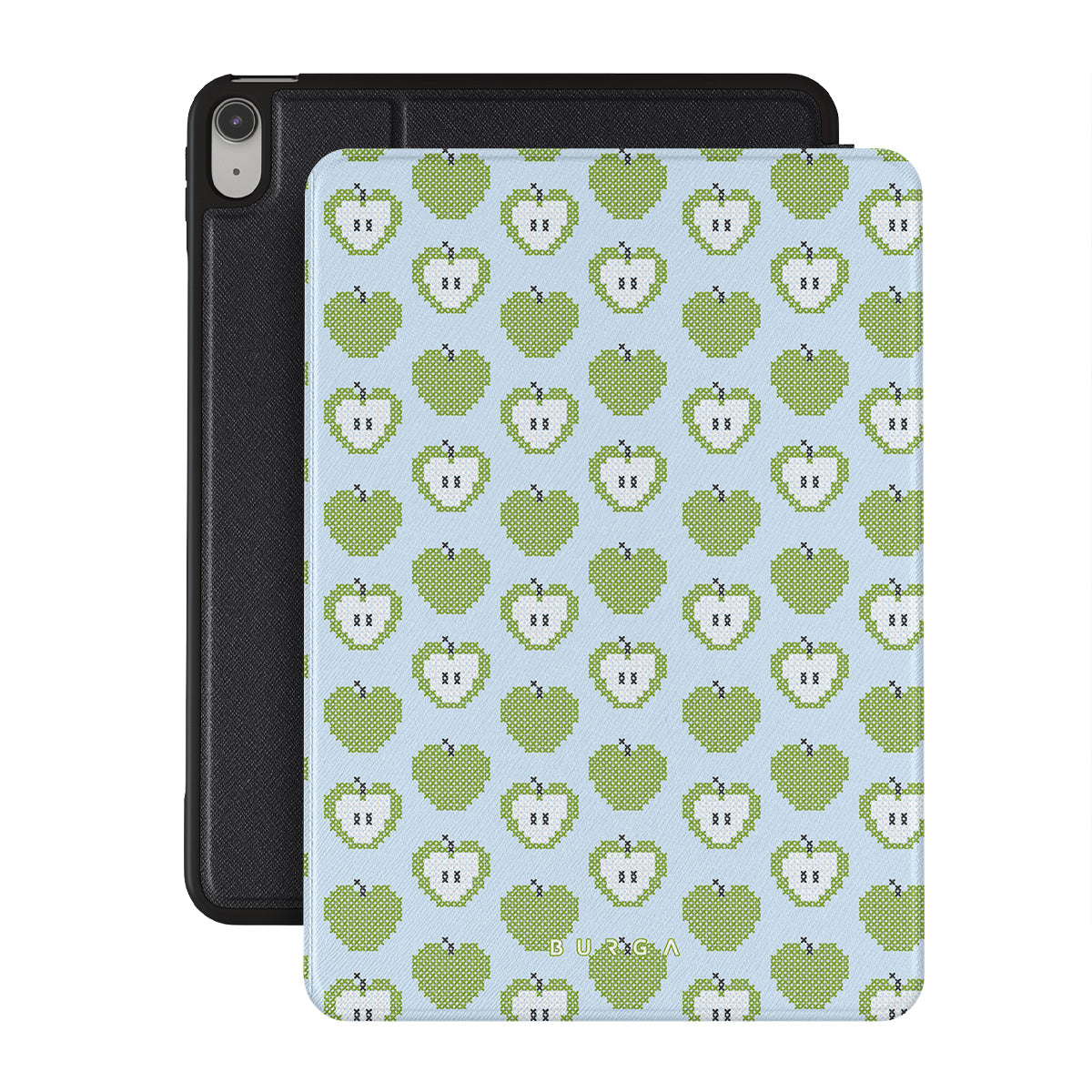 En este diseño: manzanas verdes, fruta mordida, motivos gráficos frutales