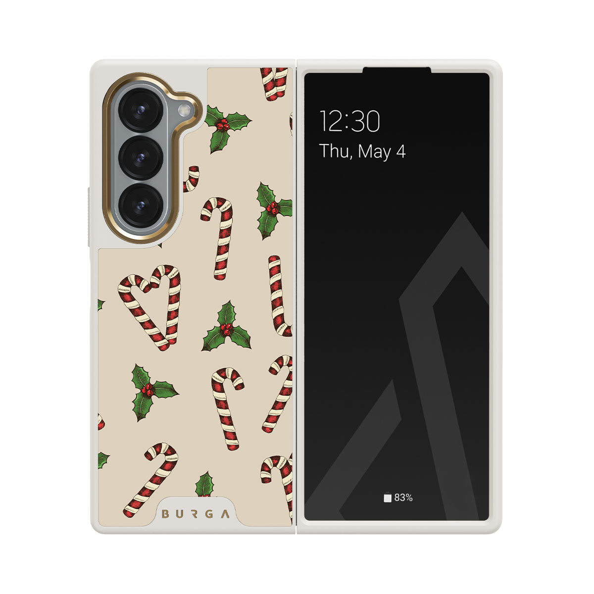El diseño presenta: bastones de caramelo, acebo, verde, blanco, patrón navideño