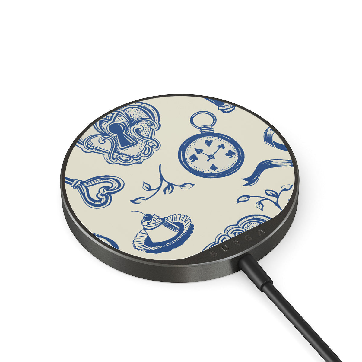 En este diseño: tazas de té, teteras, relojes de bolsillo, llave, corazones, cerámica, patrón azul y blanco