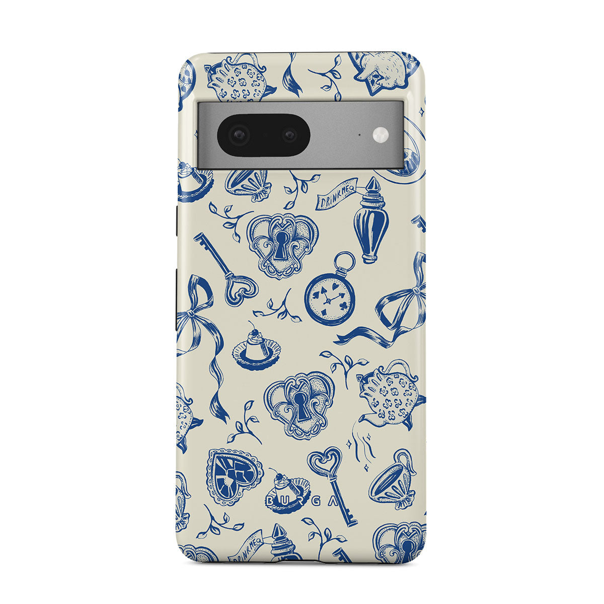 En este diseño: tazas de té, teteras, relojes de bolsillo, llave, corazones, cerámica, patrón azul y blanco