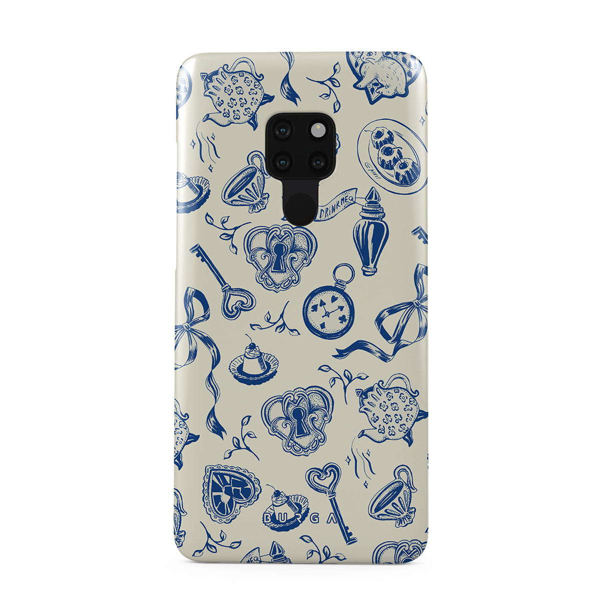 En este diseño: tazas de té, teteras, relojes de bolsillo, llave, corazones, cerámica, patrón azul y blanco