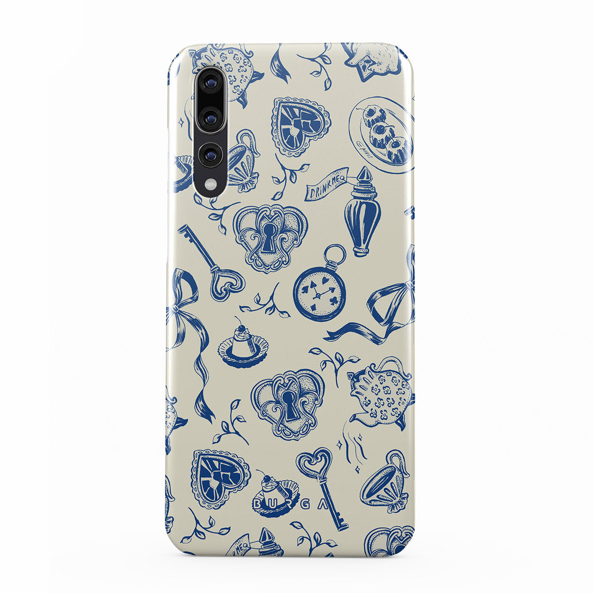 En este diseño: tazas de té, teteras, relojes de bolsillo, llave, corazones, cerámica, patrón azul y blanco