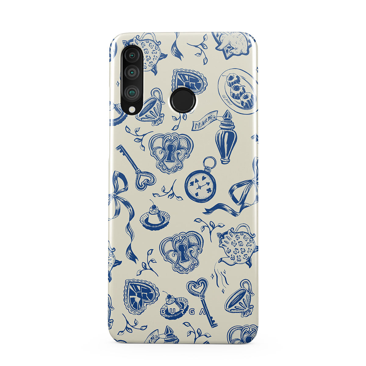 En este diseño: tazas de té, teteras, relojes de bolsillo, llave, corazones, cerámica, patrón azul y blanco
