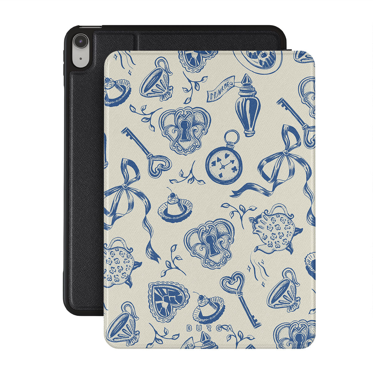 En este diseño: tazas de té, teteras, relojes de bolsillo, llave, corazones, cerámica, patrón azul y blanco