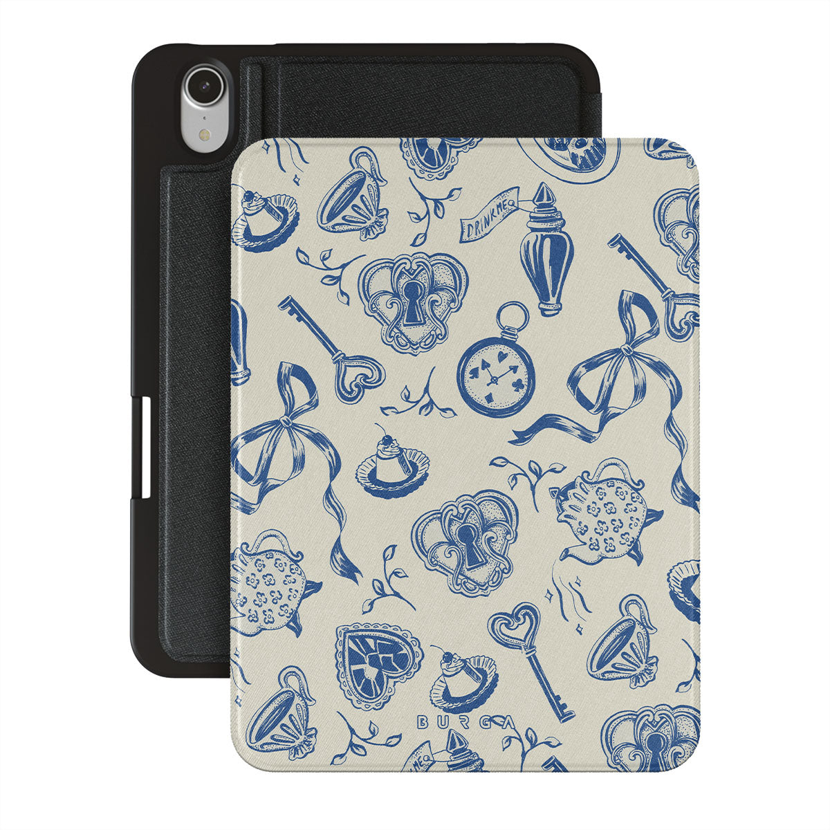 En este diseño: tazas de té, teteras, relojes de bolsillo, llave, corazones, cerámica, patrón azul y blanco