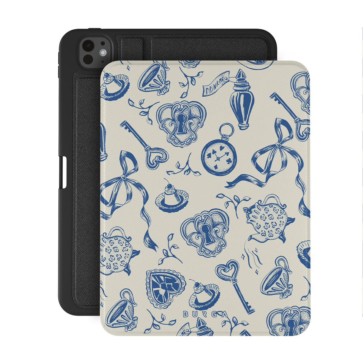 En este diseño: tazas de té, teteras, relojes de bolsillo, llave, corazones, cerámica, patrón azul y blanco