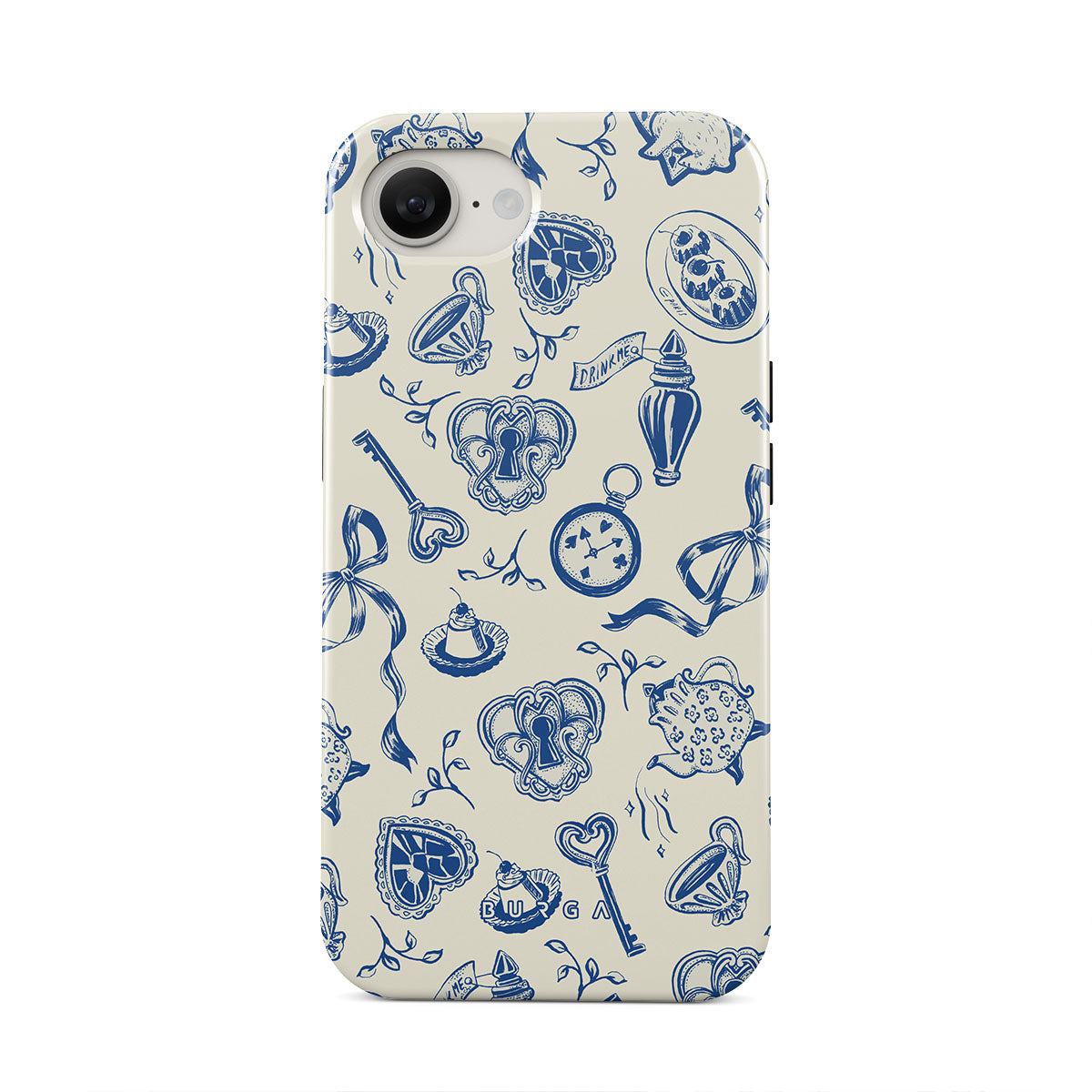 En este diseño: tazas de té, teteras, relojes de bolsillo, llave, corazones, cerámica, patrón azul y blanco