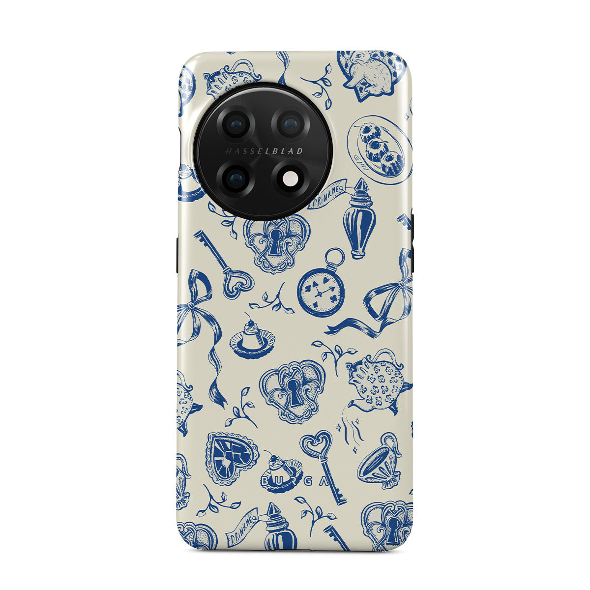 En este diseño: tazas de té, teteras, relojes de bolsillo, llave, corazones, cerámica, patrón azul y blanco