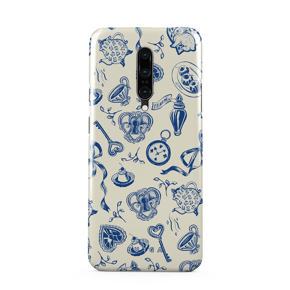 En este diseño: tazas de té, teteras, relojes de bolsillo, llave, corazones, cerámica, patrón azul y blanco