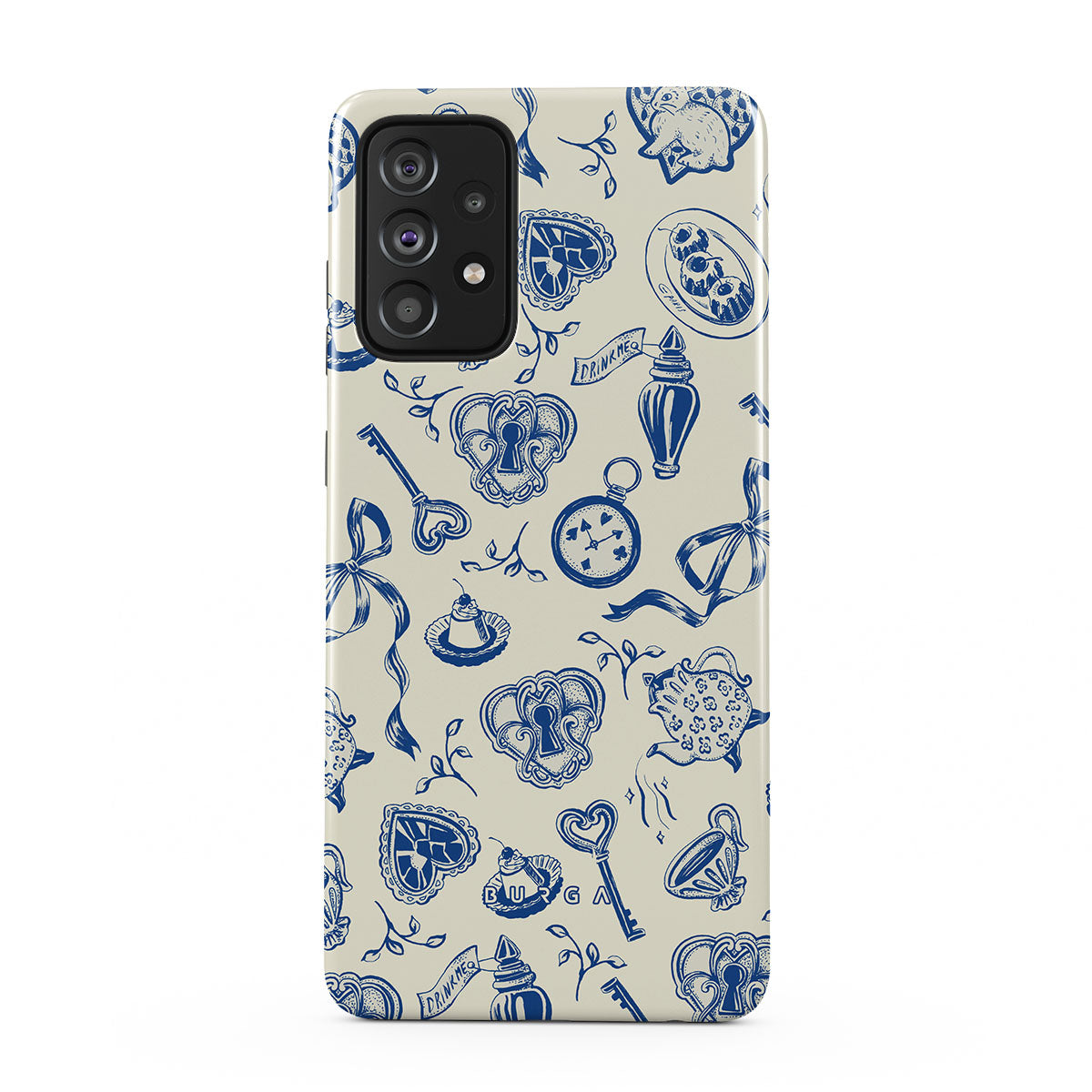 En este diseño: tazas de té, teteras, relojes de bolsillo, llave, corazones, cerámica, patrón azul y blanco