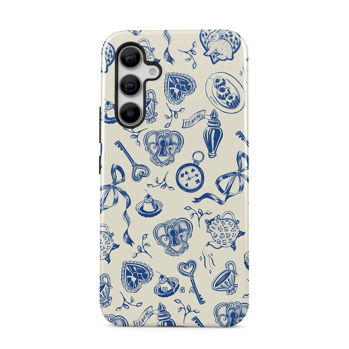 En este diseño: tazas de té, teteras, relojes de bolsillo, llave, corazones, cerámica, patrón azul y blanco