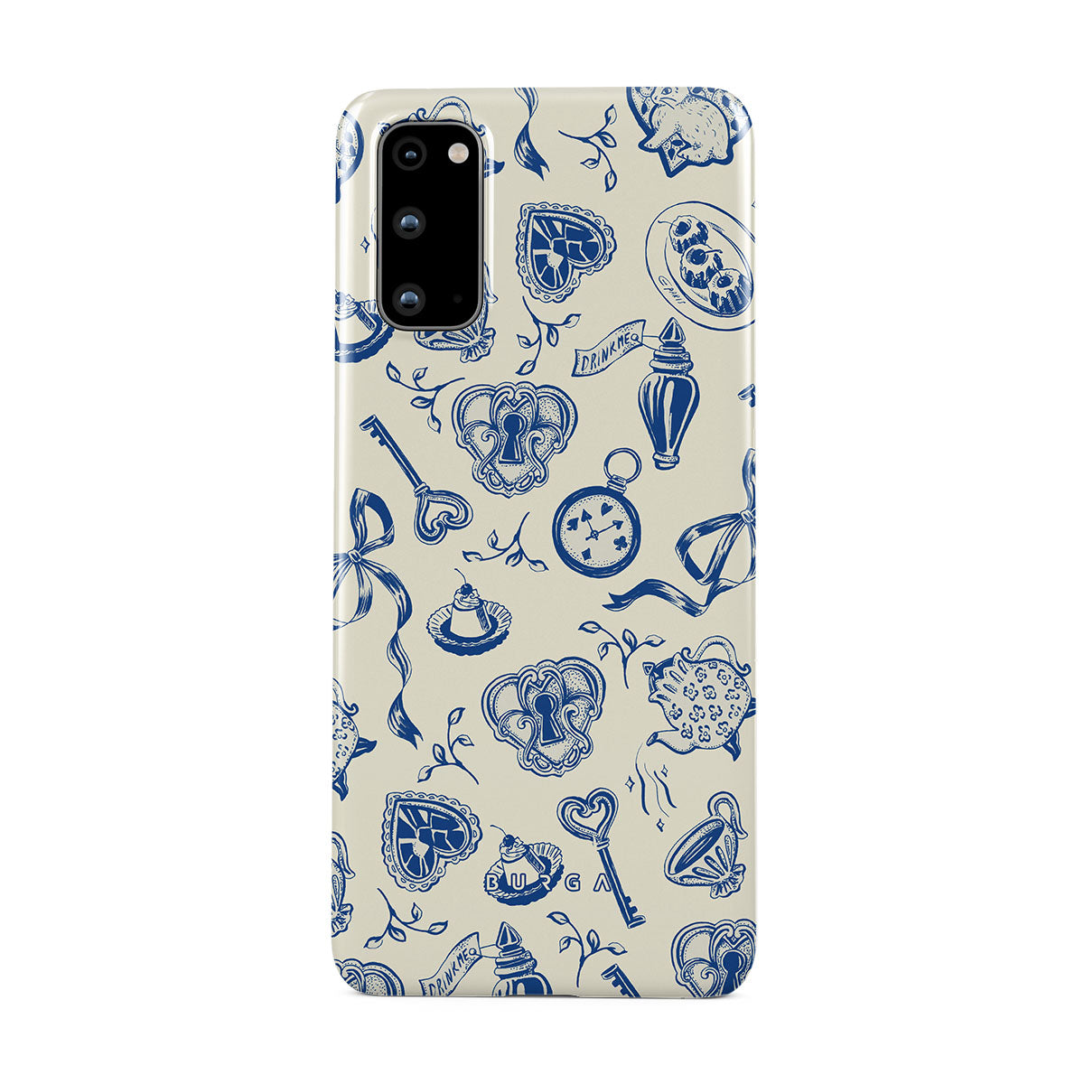 En este diseño: tazas de té, teteras, relojes de bolsillo, llave, corazones, cerámica, patrón azul y blanco