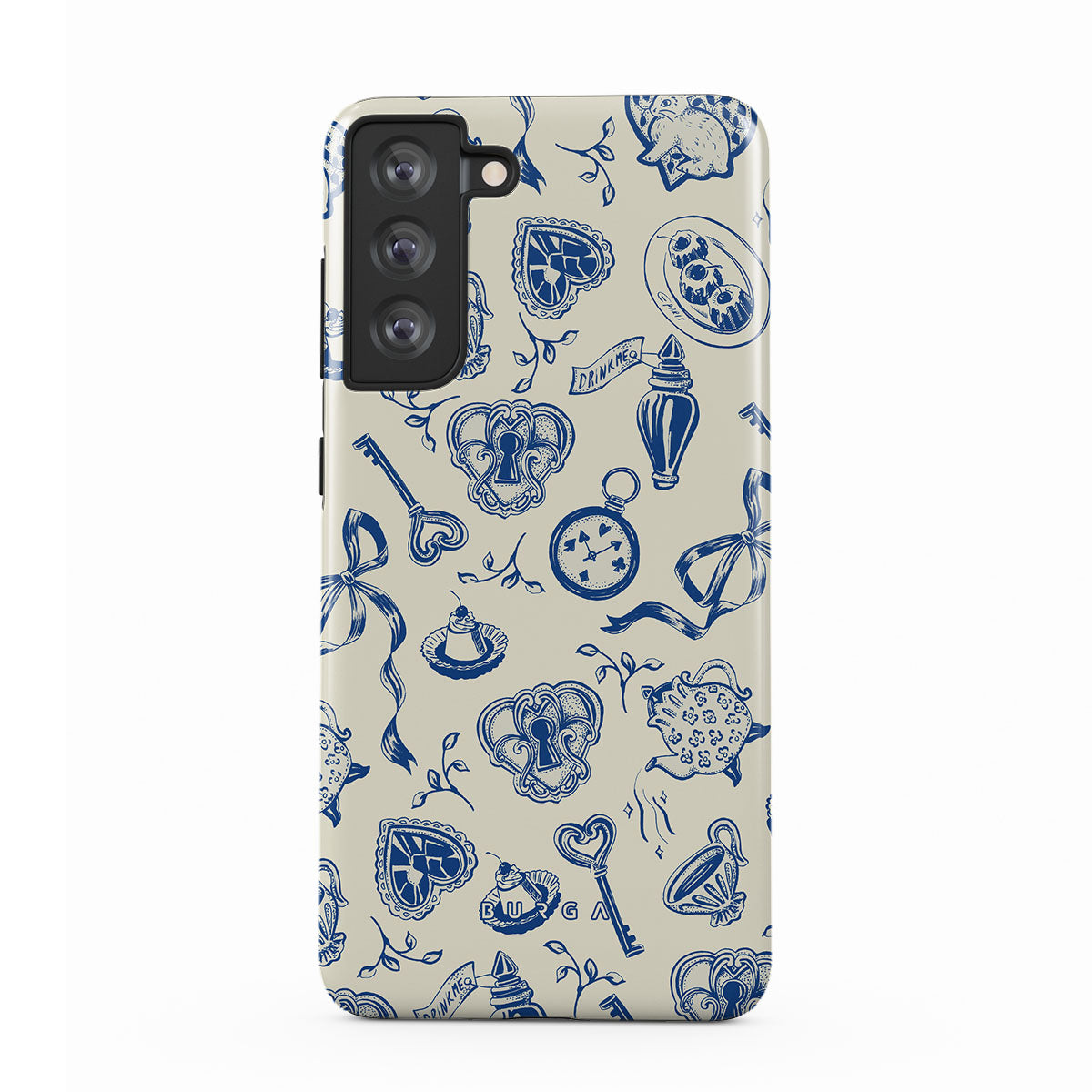 En este diseño: tazas de té, teteras, relojes de bolsillo, llave, corazones, cerámica, patrón azul y blanco