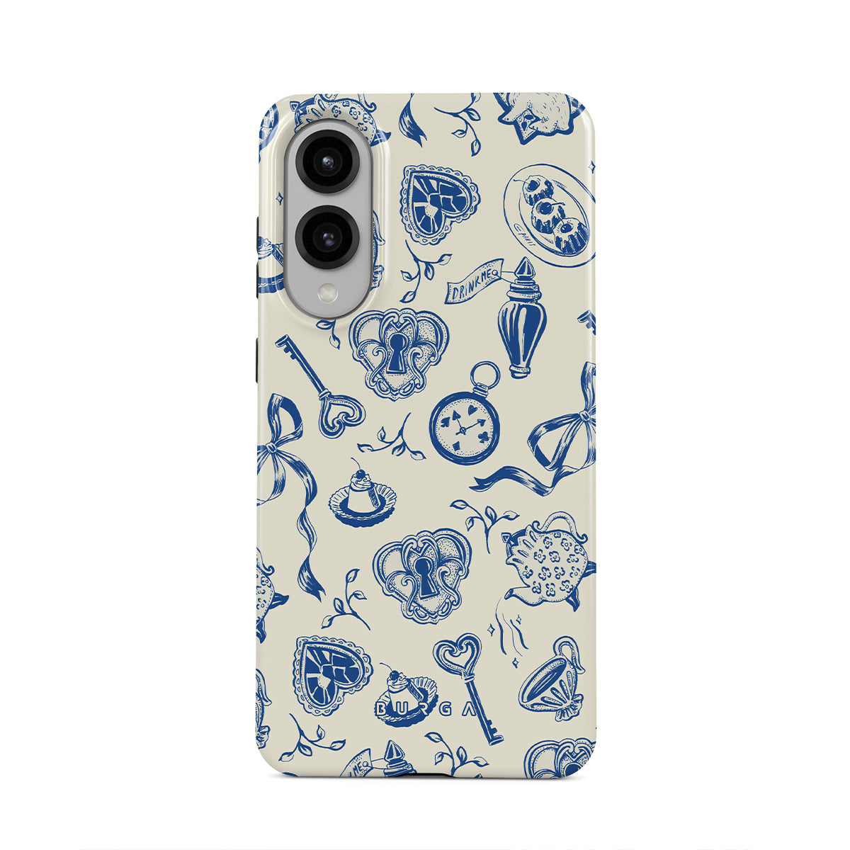 En este diseño: tazas de té, teteras, relojes de bolsillo, llave, corazones, cerámica, patrón azul y blanco
