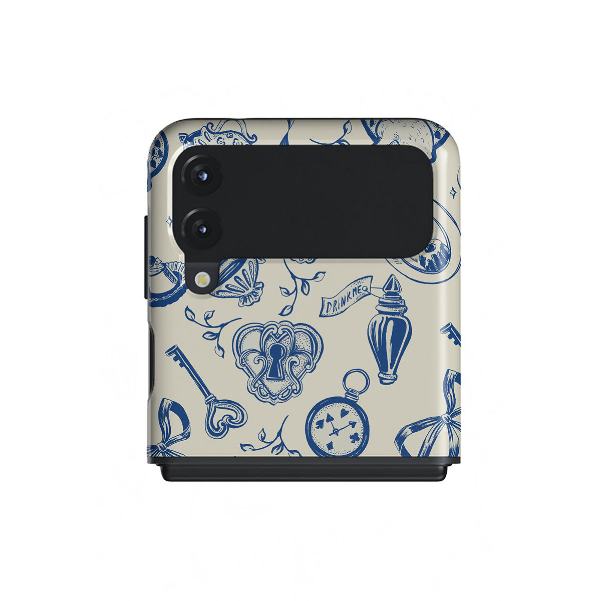 En este diseño: tazas de té, teteras, relojes de bolsillo, llave, corazones, cerámica, patrón azul y blanco
