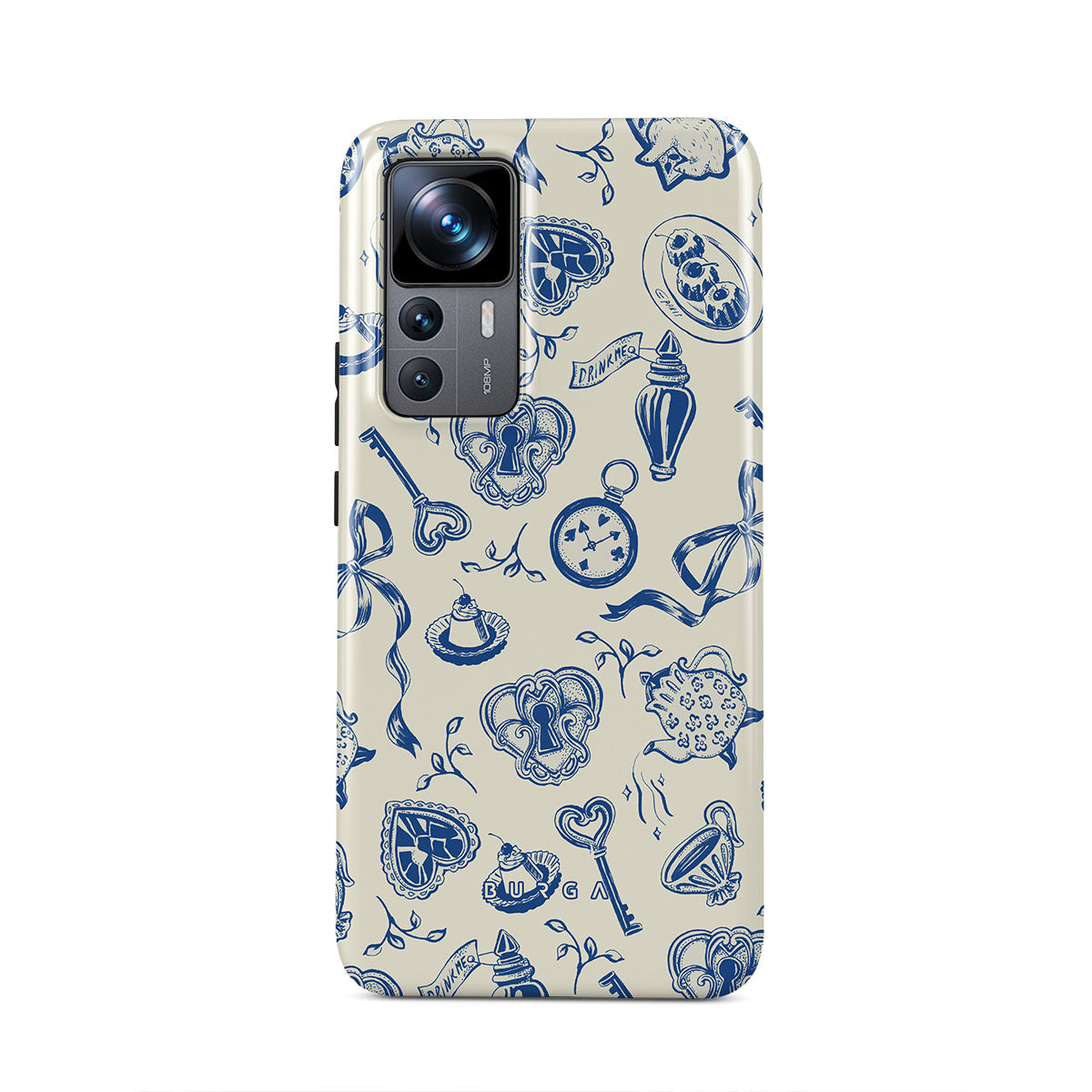 En este diseño: tazas de té, teteras, relojes de bolsillo, llave, corazones, cerámica, patrón azul y blanco