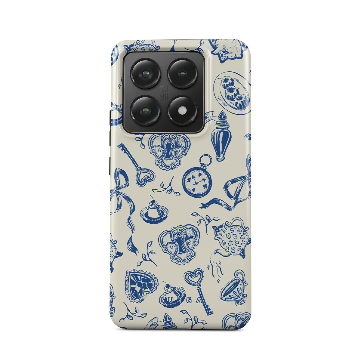 En este diseño: tazas de té, teteras, relojes de bolsillo, llave, corazones, cerámica, patrón azul y blanco
