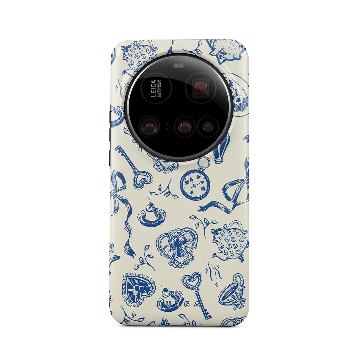 En este diseño: tazas de té, teteras, relojes de bolsillo, llave, corazones, cerámica, patrón azul y blanco