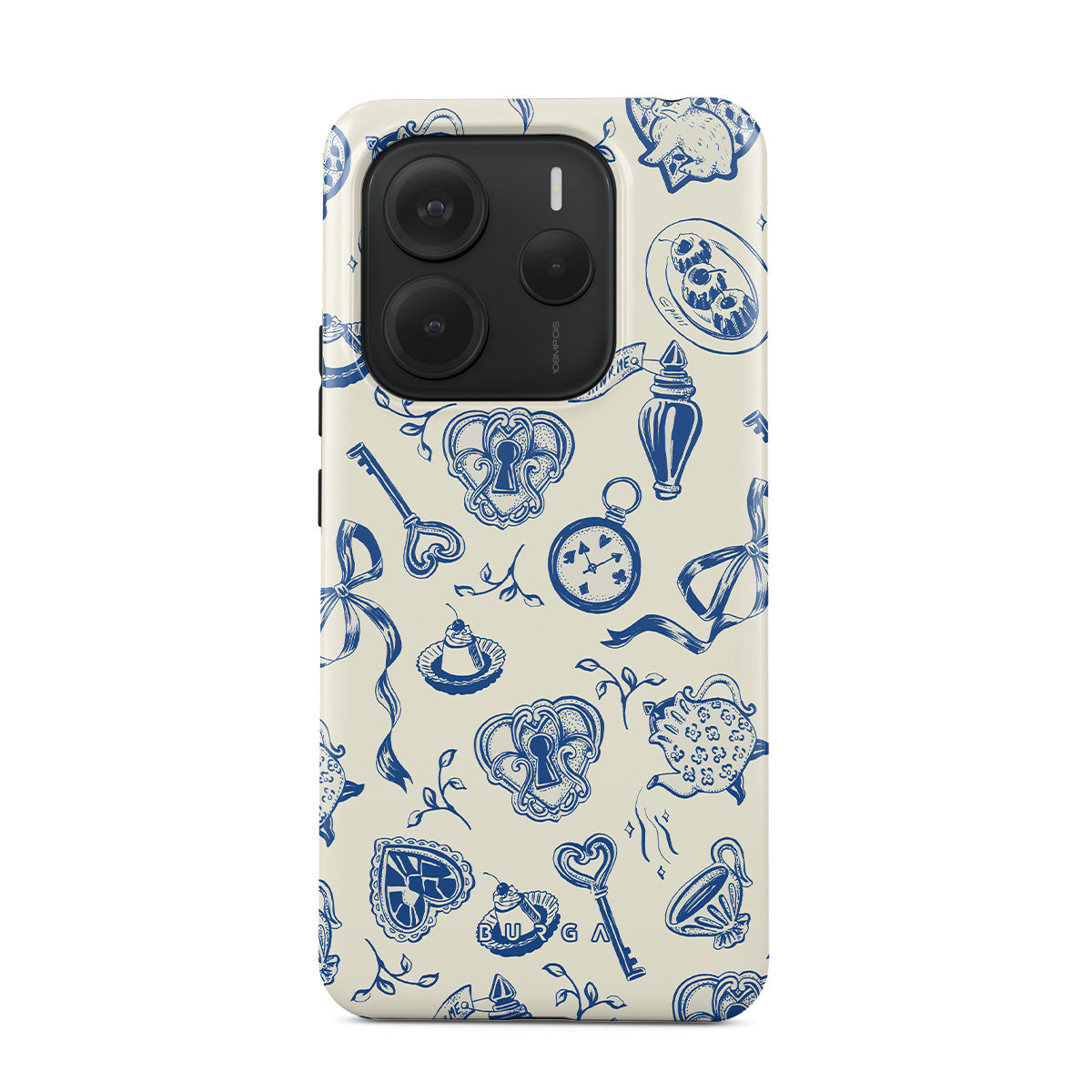 En este diseño: tazas de té, teteras, relojes de bolsillo, llave, corazones, cerámica, patrón azul y blanco