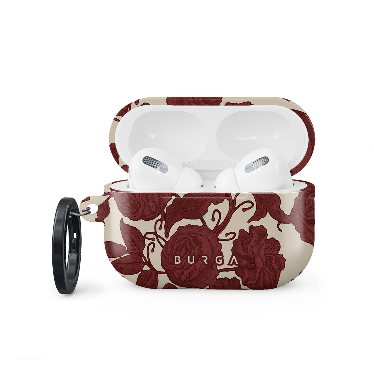 En este diseño: rosas rojo oscuro, patrón floral intrincado y estampado vintage.