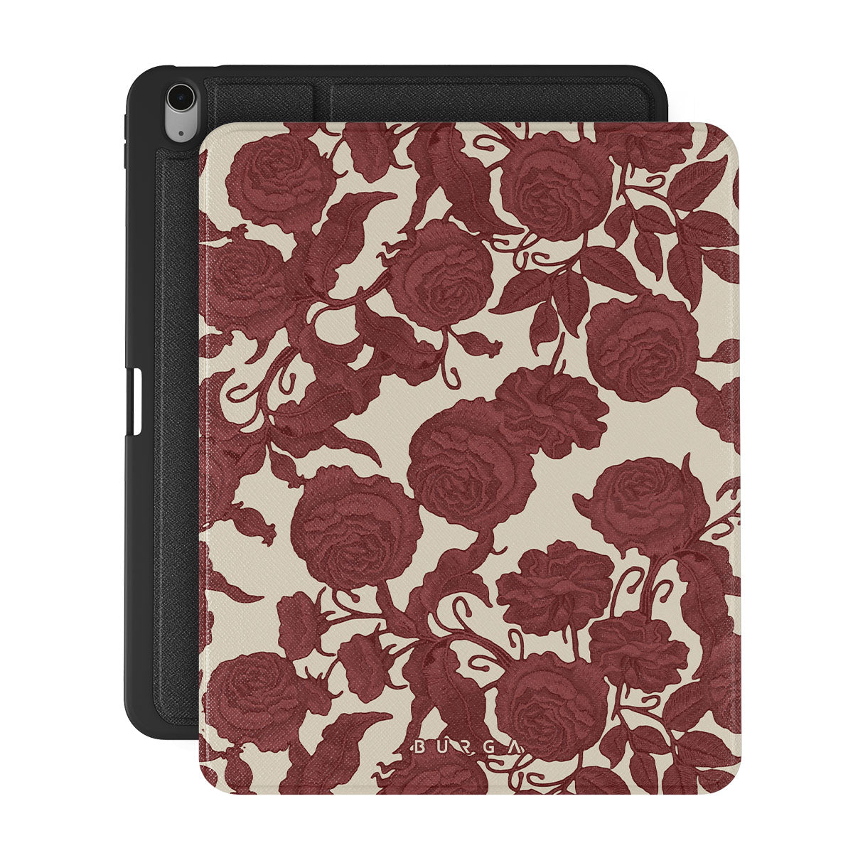 En este diseño: rosas rojo oscuro, patrón floral intrincado y estampado vintage.