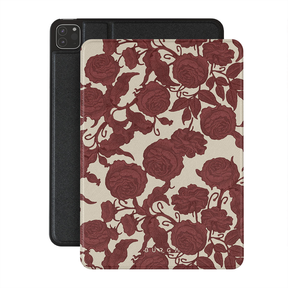 En este diseño: rosas rojo oscuro, patrón floral intrincado y estampado vintage.