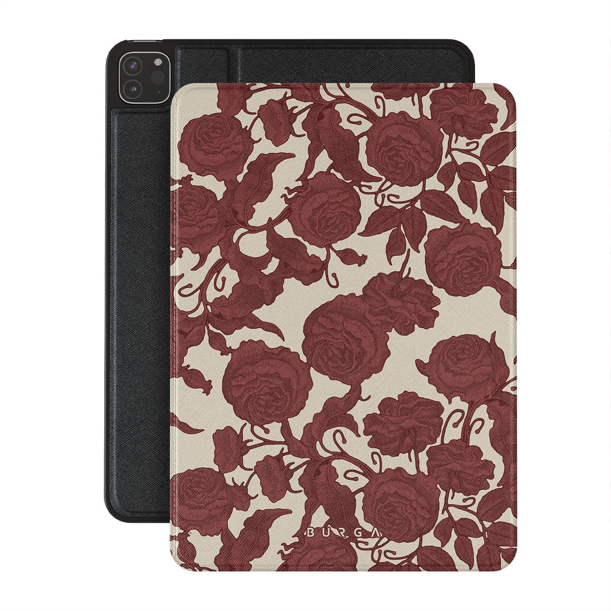 En este diseño: rosas rojo oscuro, patrón floral intrincado y estampado vintage.