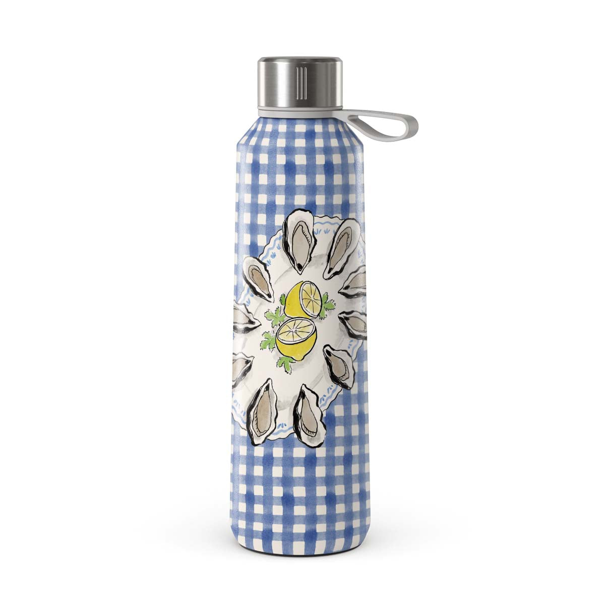 En este diseño: Ostras, limón, cuadros azules, elementos costeros frescos, tonos suaves pastel.