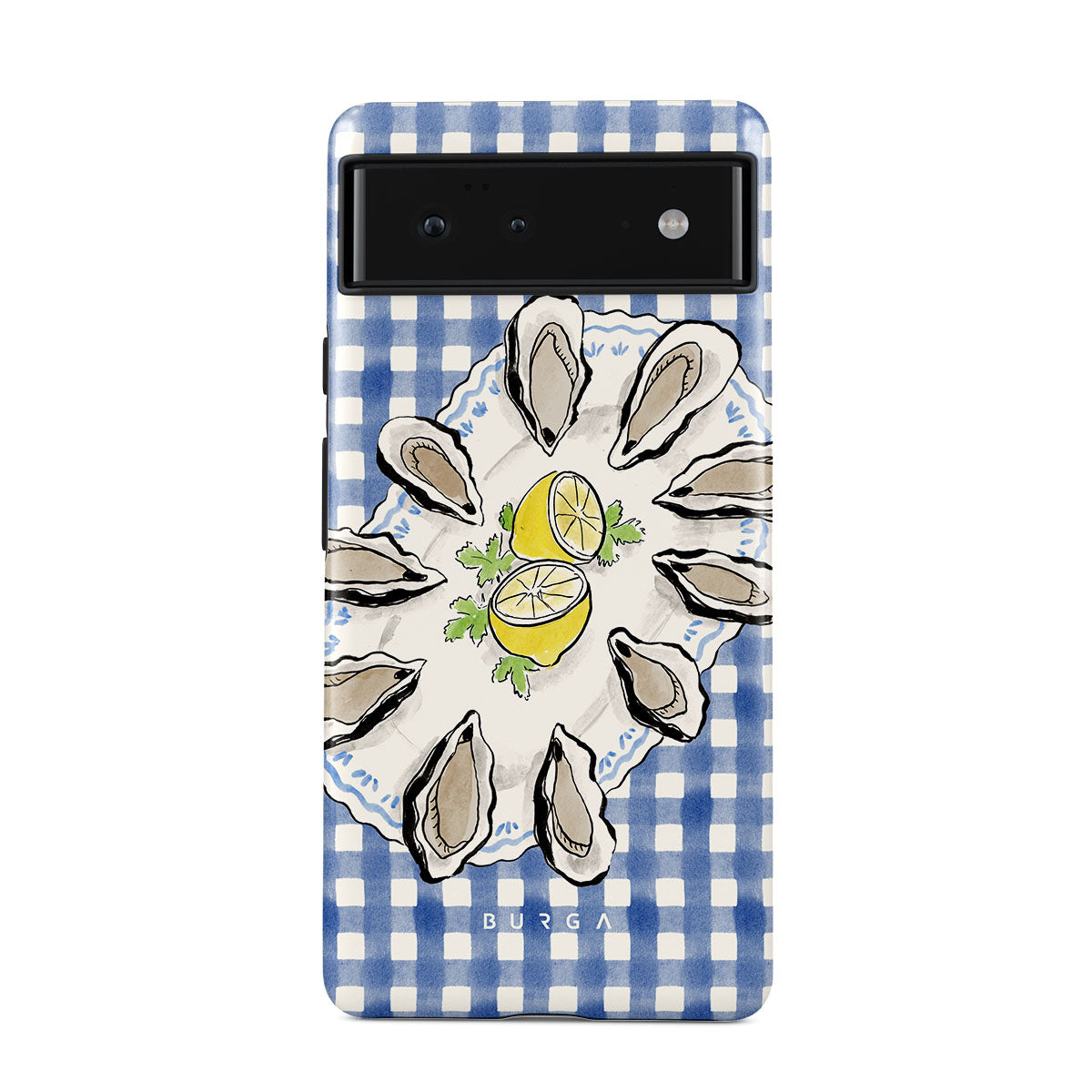 En este diseño: Ostras, limón, cuadros azules, elementos costeros frescos, tonos suaves pastel.