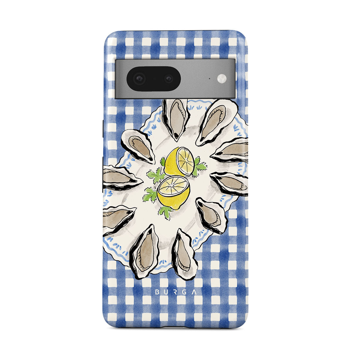 En este diseño: Ostras, limón, cuadros azules, elementos costeros frescos, tonos suaves pastel.