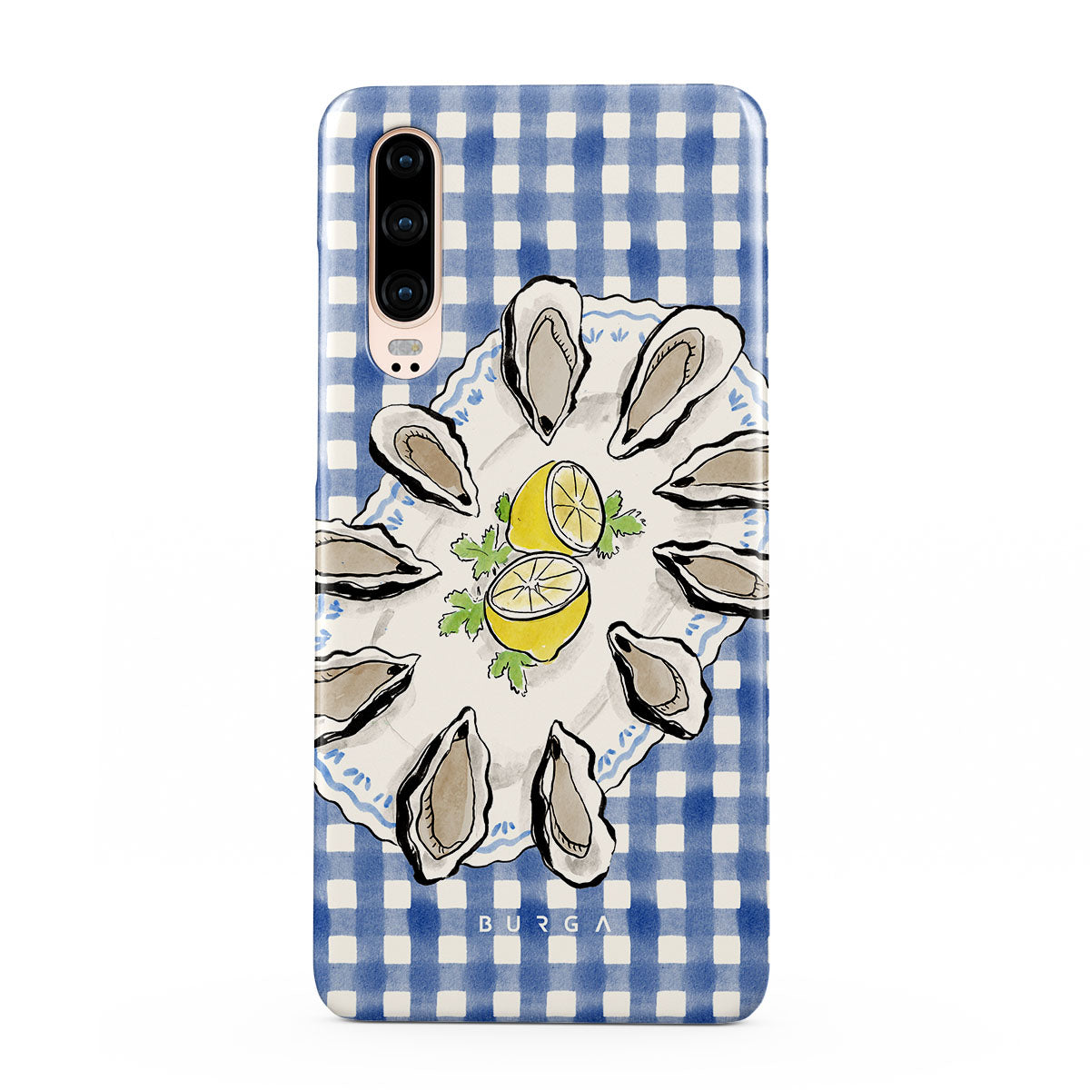 En este diseño: Ostras, limón, cuadros azules, elementos costeros frescos, tonos suaves pastel.