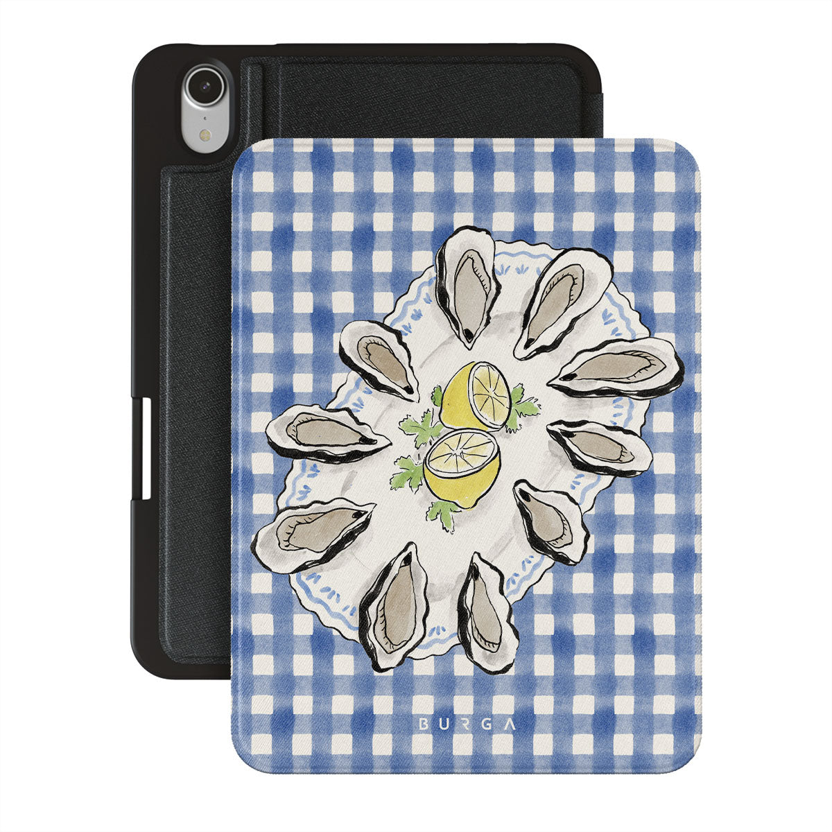 En este diseño: Ostras, limón, cuadros azules, elementos costeros frescos, tonos suaves pastel.