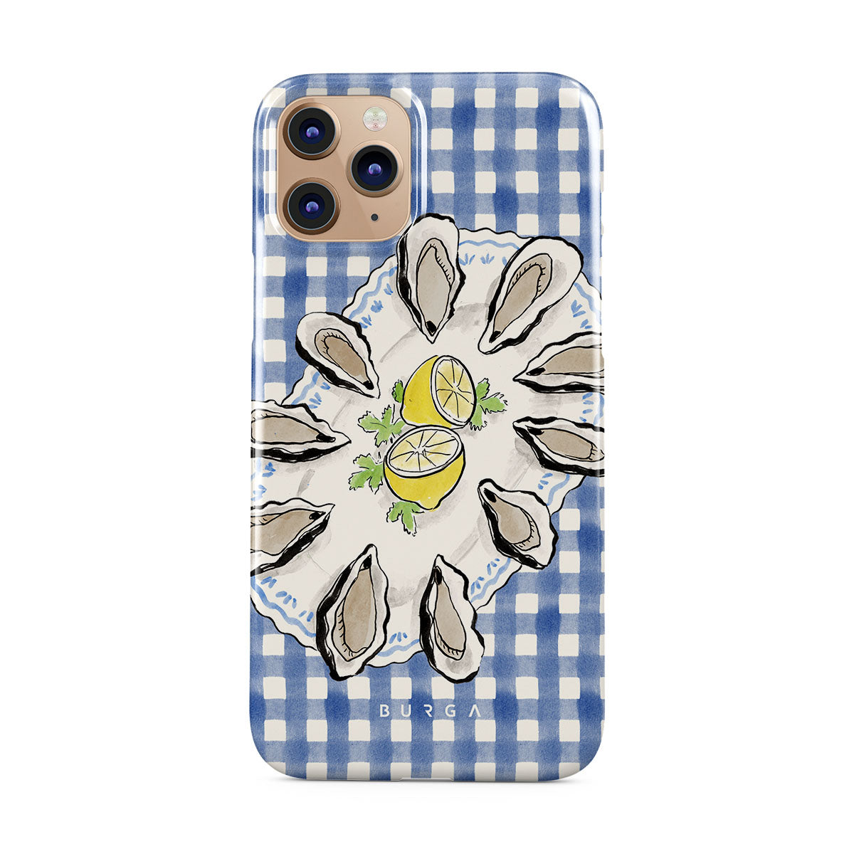 En este diseño: Ostras, limón, cuadros azules, elementos costeros frescos, tonos suaves pastel.