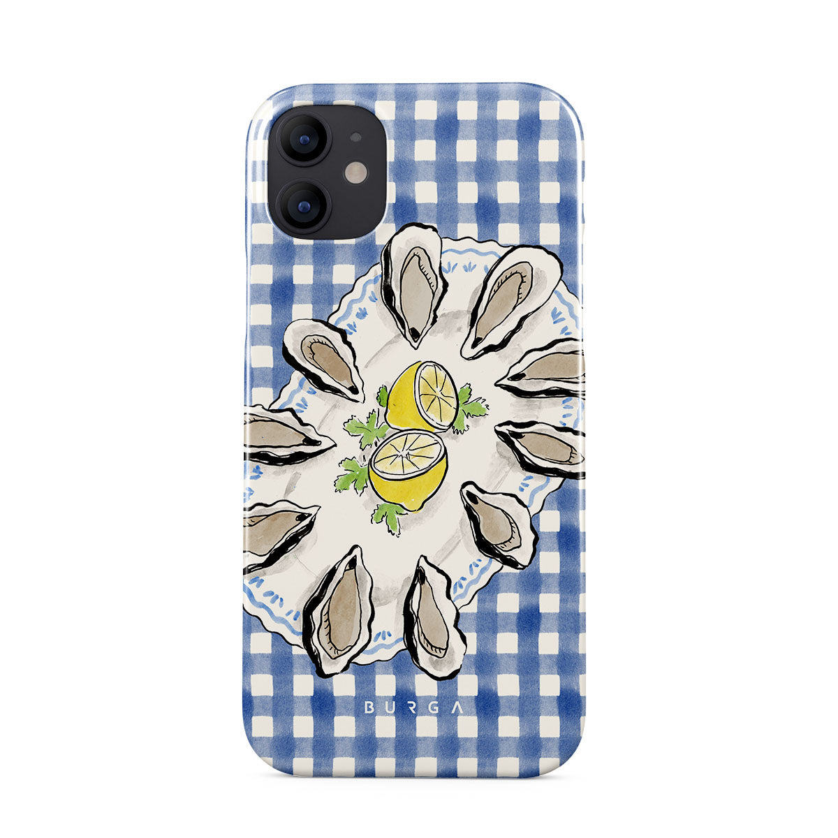 En este diseño: Ostras, limón, cuadros azules, elementos costeros frescos, tonos suaves pastel.