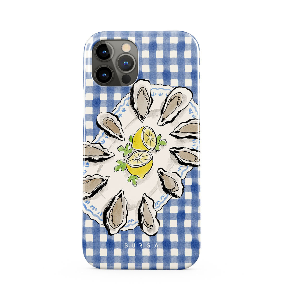 En este diseño: Ostras, limón, cuadros azules, elementos costeros frescos, tonos suaves pastel.