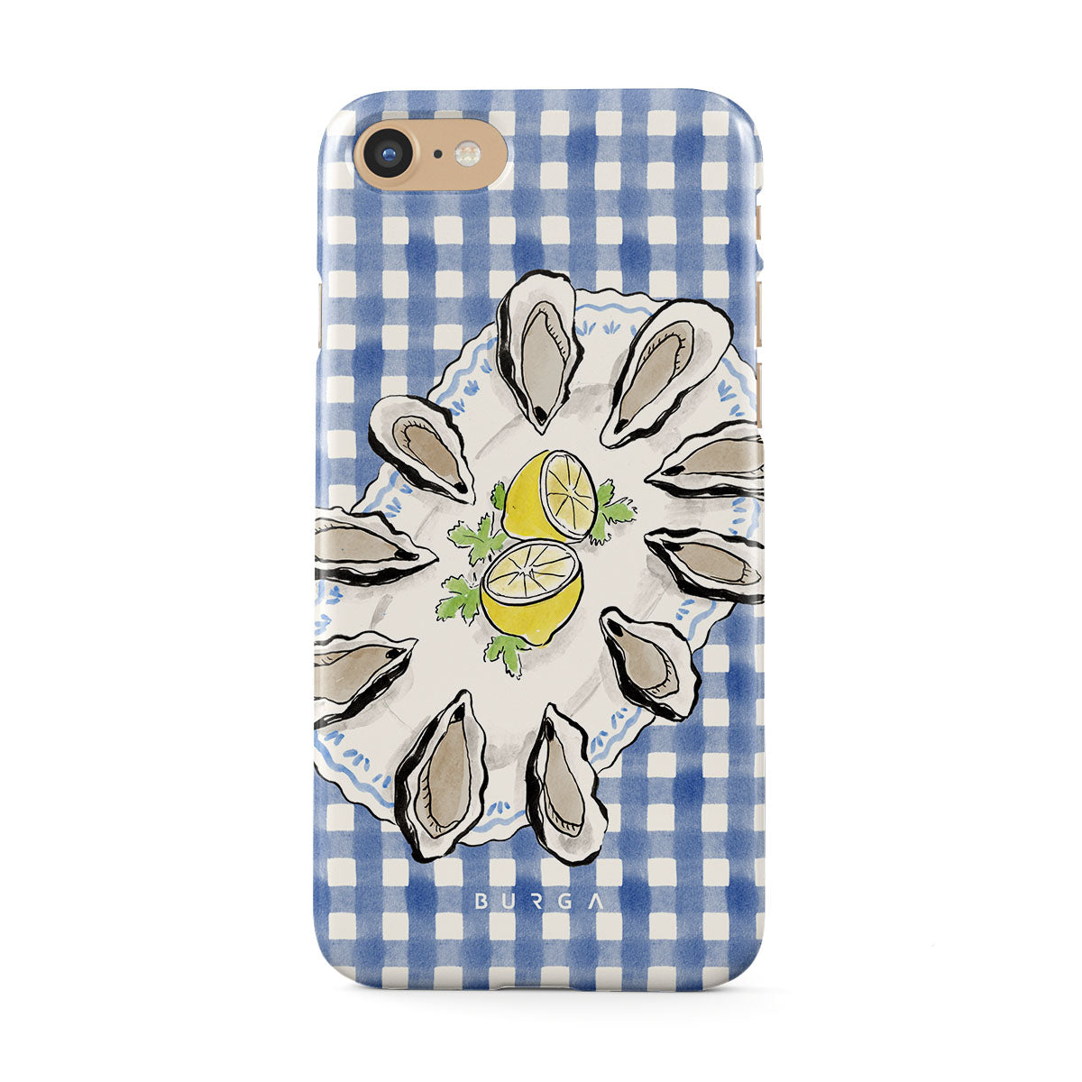 En este diseño: Ostras, limón, cuadros azules, elementos costeros frescos, tonos suaves pastel.