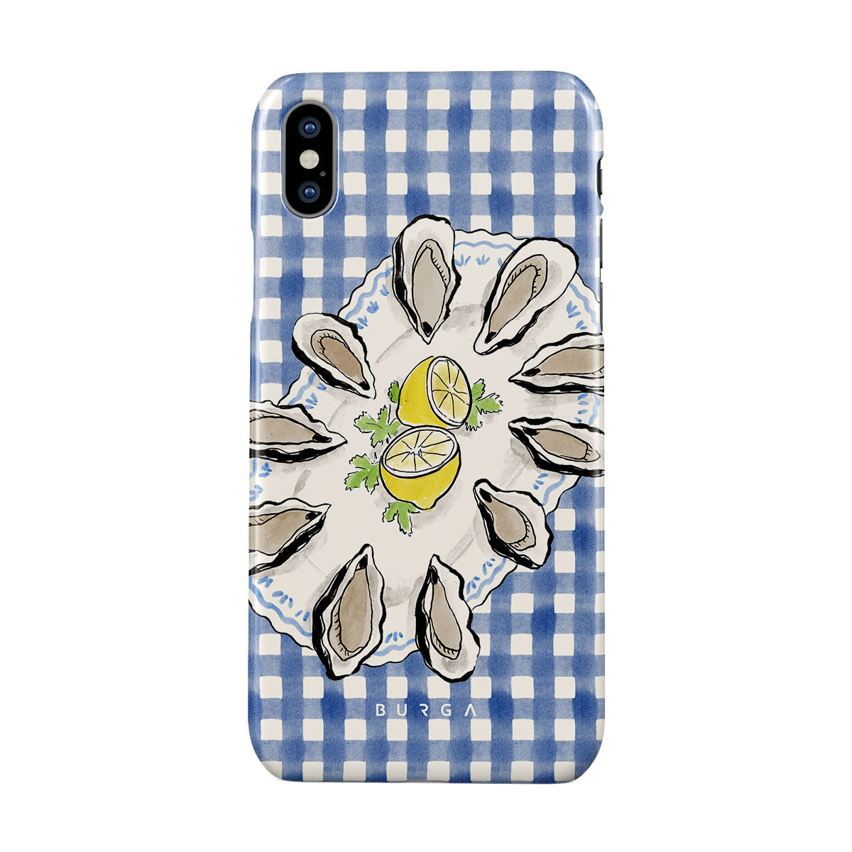 En este diseño: Ostras, limón, cuadros azules, elementos costeros frescos, tonos suaves pastel.