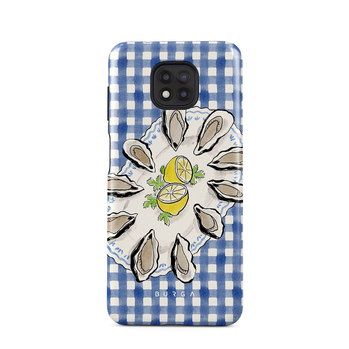 En este diseño: Ostras, limón, cuadros azules, elementos costeros frescos, tonos suaves pastel.