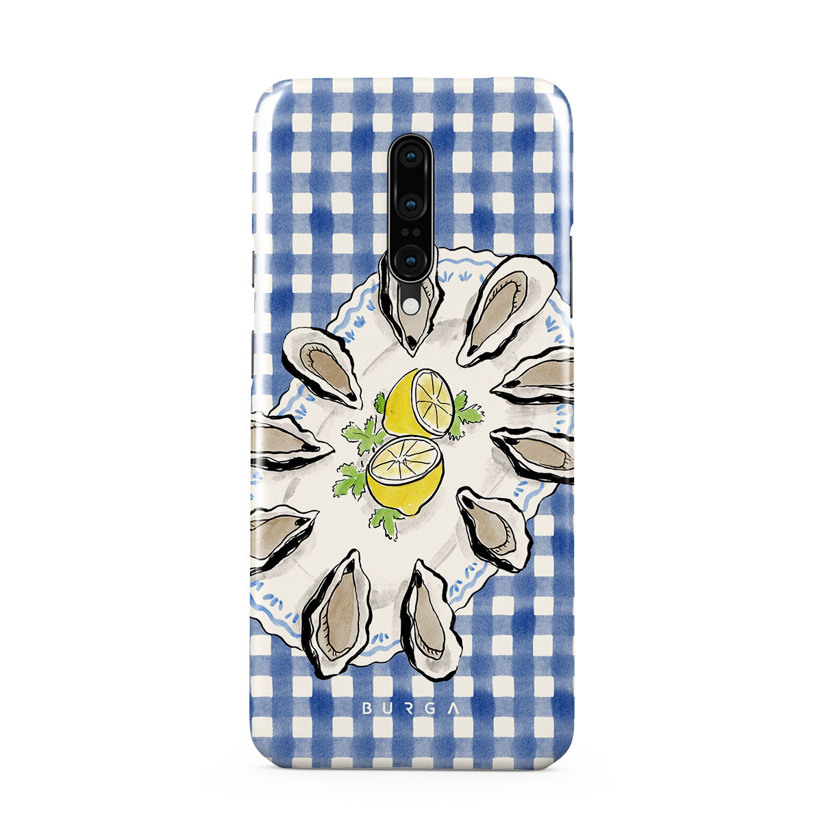 En este diseño: Ostras, limón, cuadros azules, elementos costeros frescos, tonos suaves pastel.