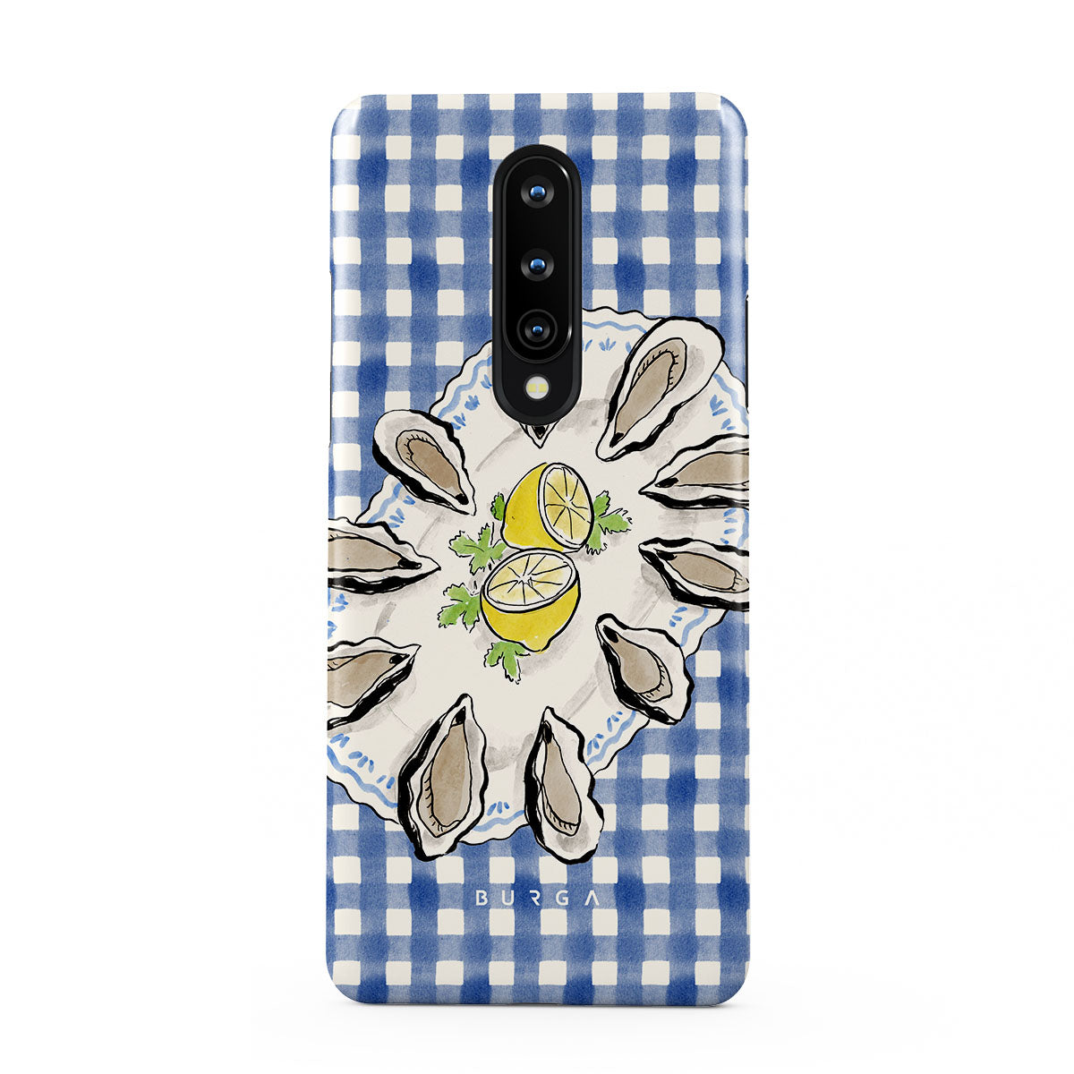 En este diseño: Ostras, limón, cuadros azules, elementos costeros frescos, tonos suaves pastel.