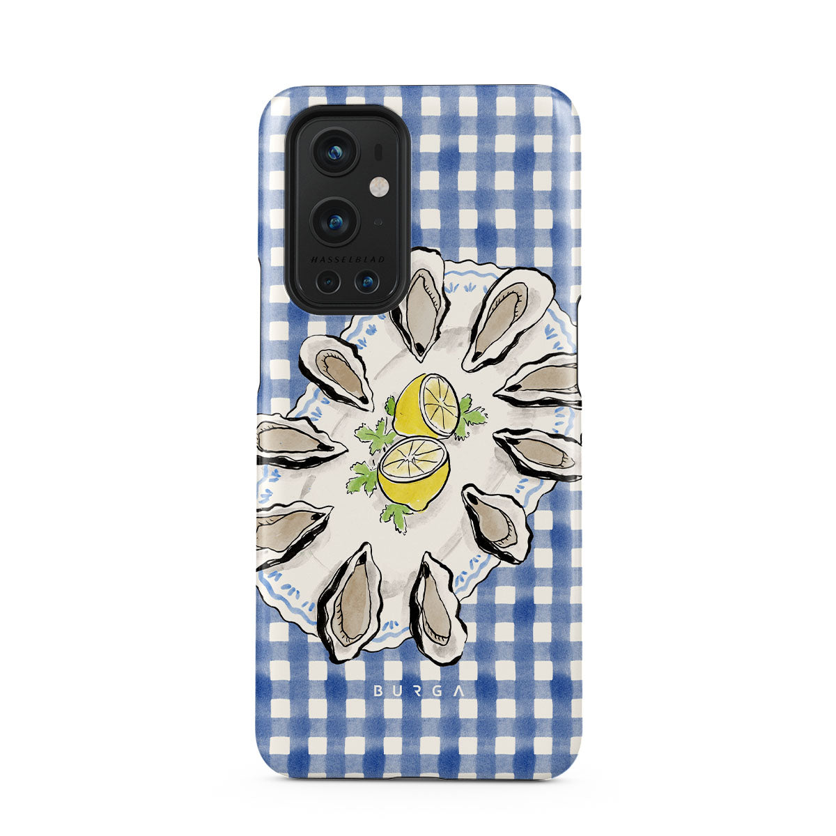 En este diseño: Ostras, limón, cuadros azules, elementos costeros frescos, tonos suaves pastel.