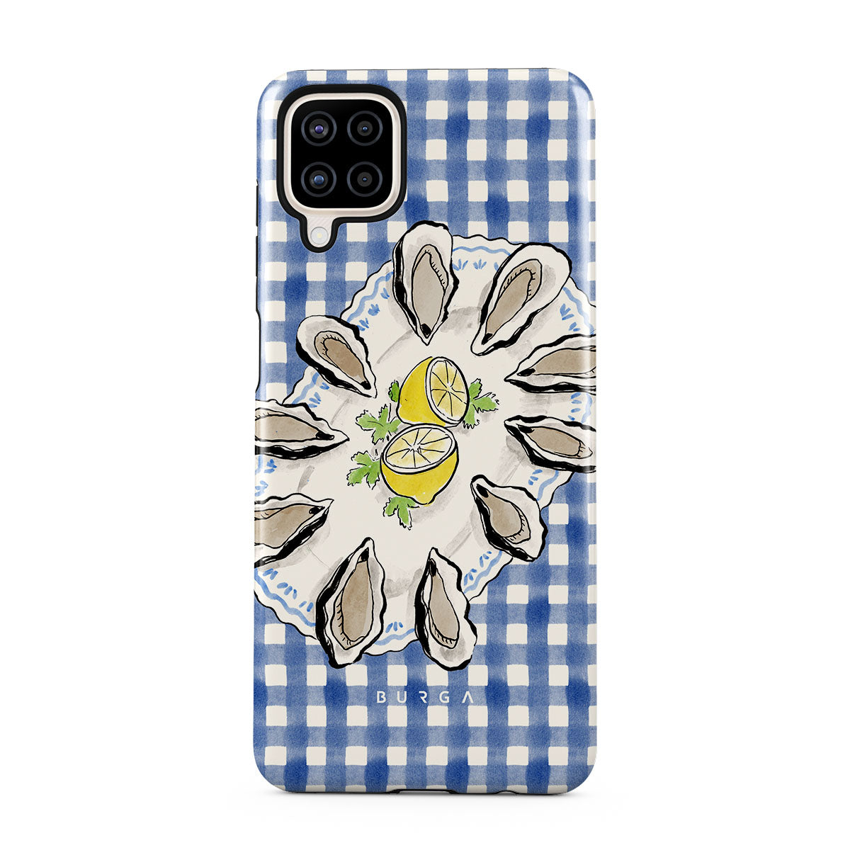 En este diseño: Ostras, limón, cuadros azules, elementos costeros frescos, tonos suaves pastel.