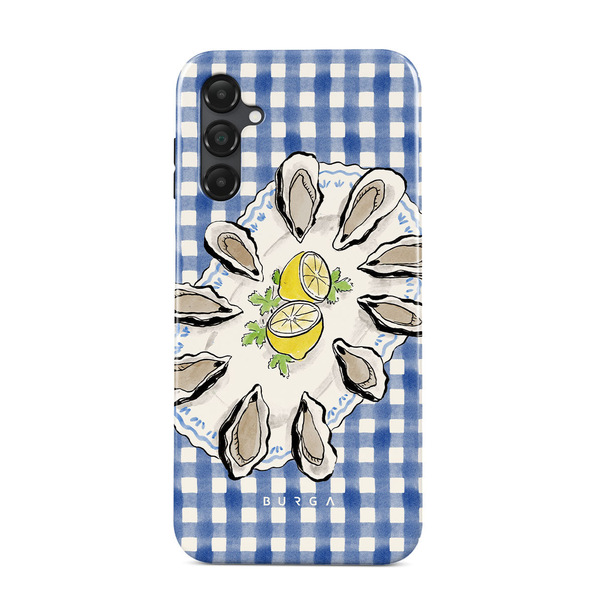En este diseño: Ostras, limón, cuadros azules, elementos costeros frescos, tonos suaves pastel.