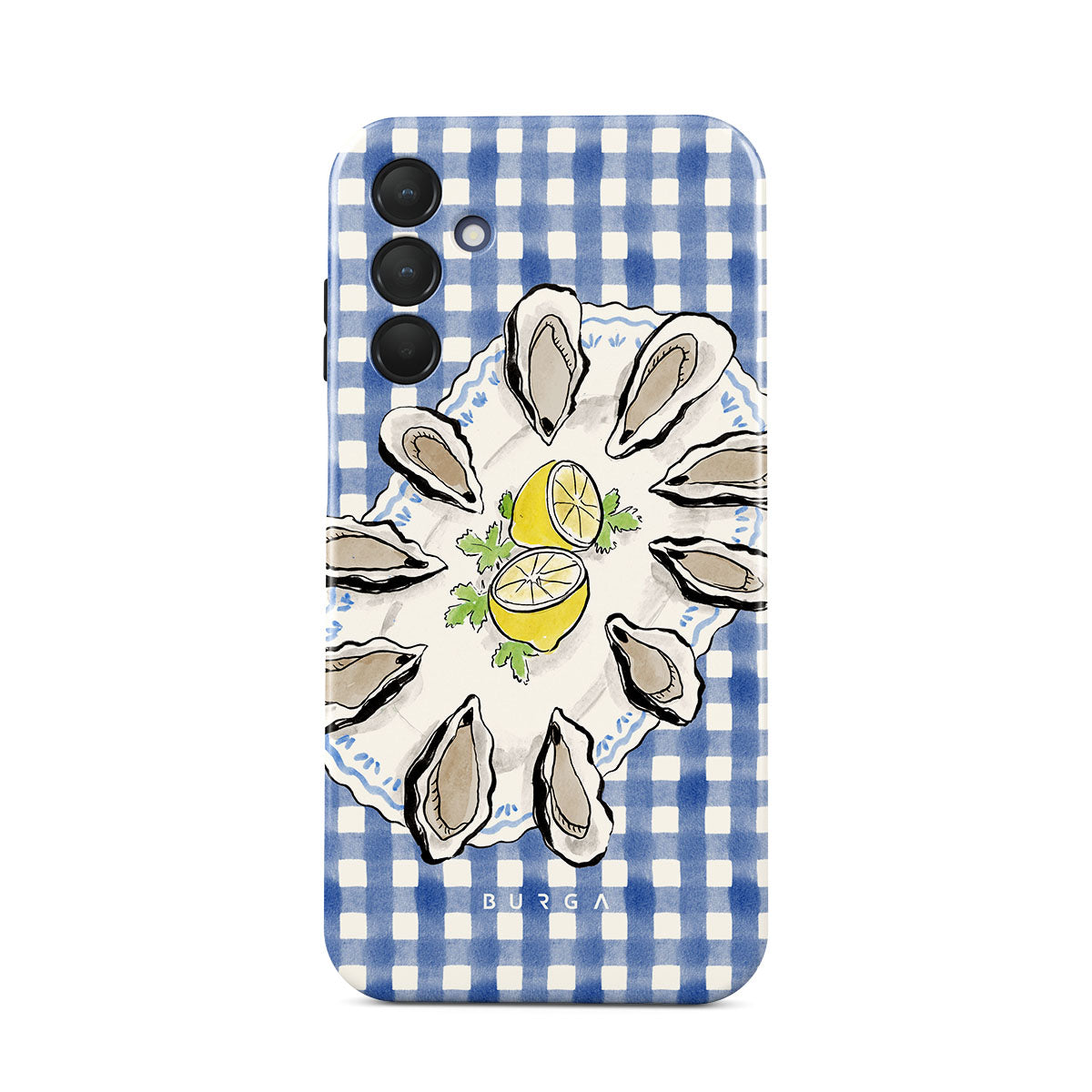 En este diseño: Ostras, limón, cuadros azules, elementos costeros frescos, tonos suaves pastel.