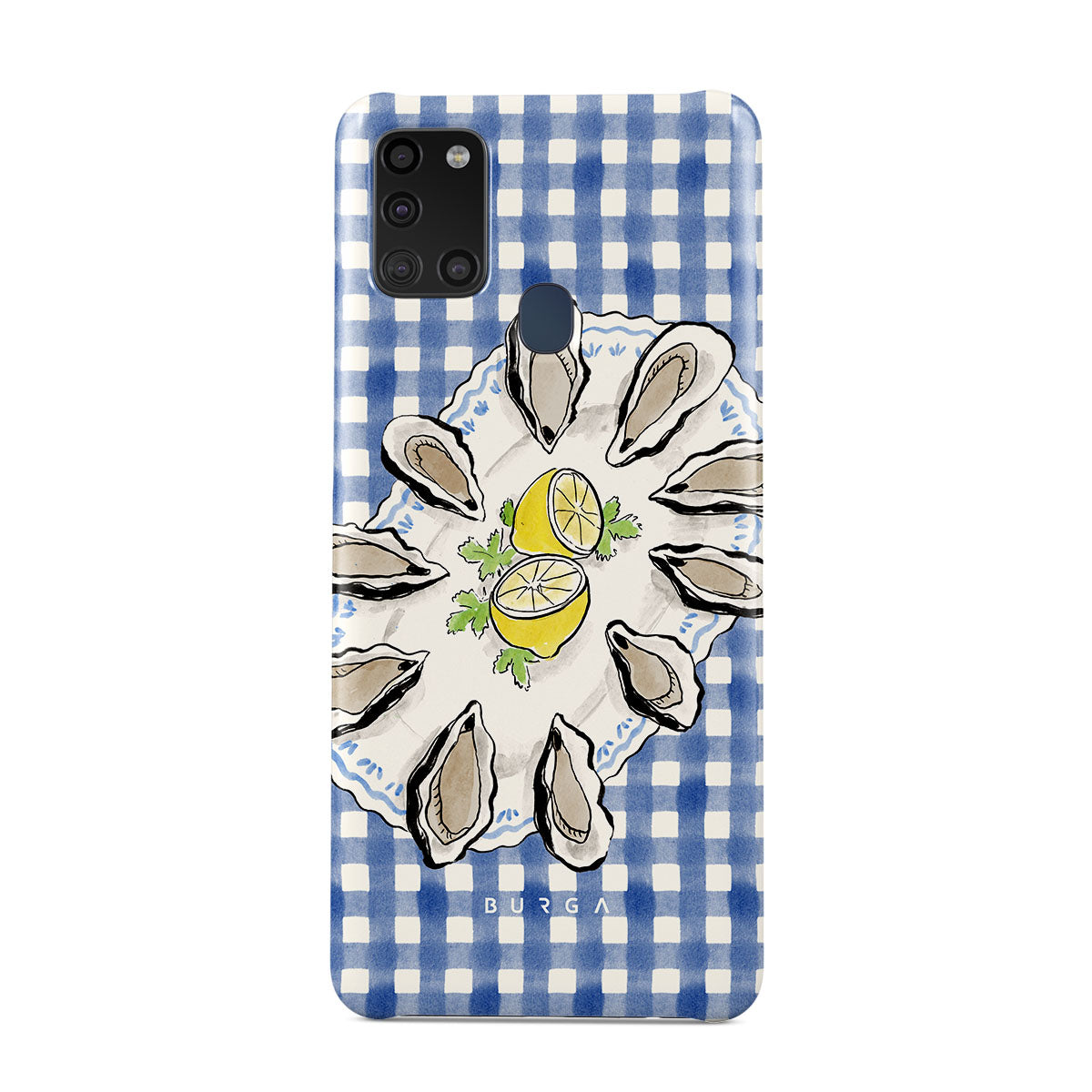 En este diseño: Ostras, limón, cuadros azules, elementos costeros frescos, tonos suaves pastel.