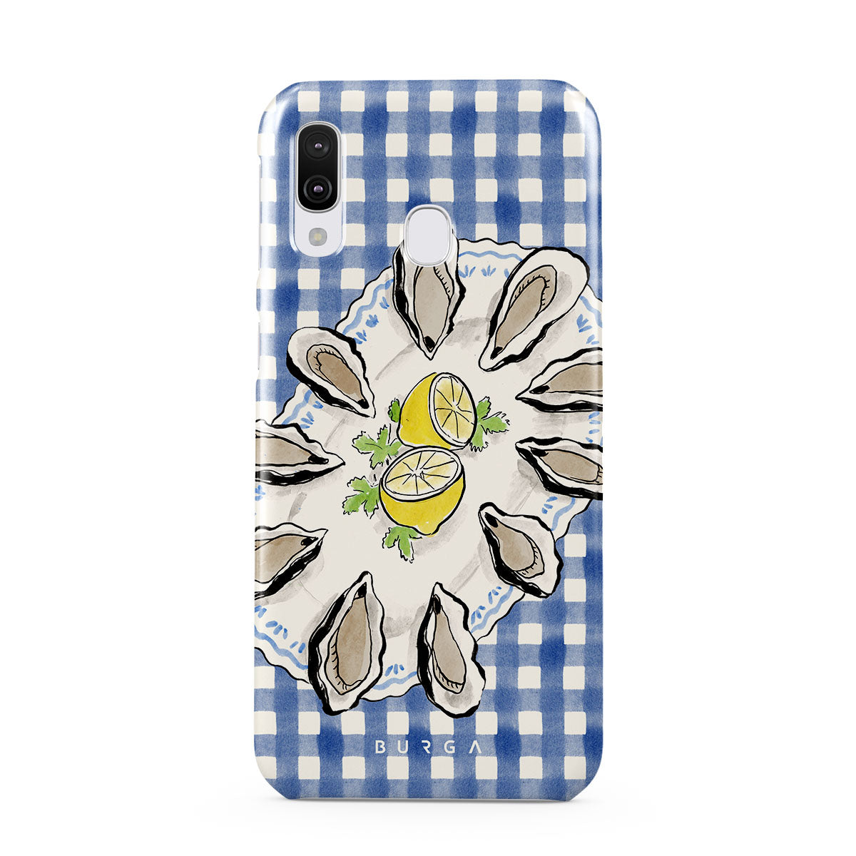 En este diseño: Ostras, limón, cuadros azules, elementos costeros frescos, tonos suaves pastel.