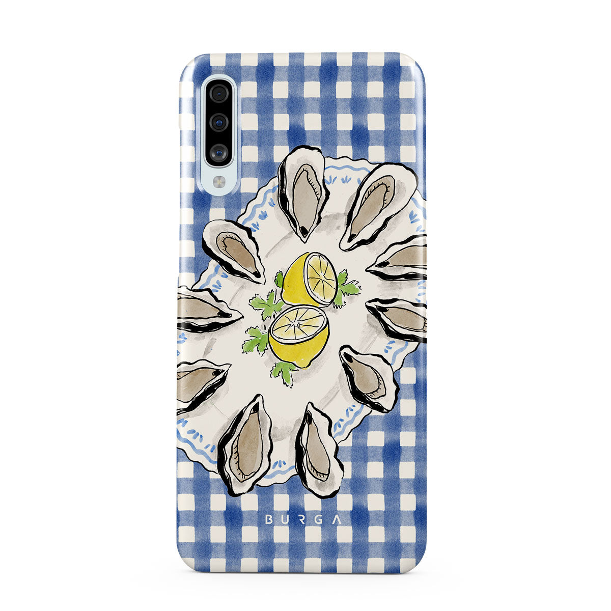 En este diseño: Ostras, limón, cuadros azules, elementos costeros frescos, tonos suaves pastel.